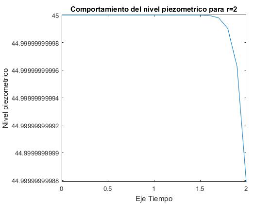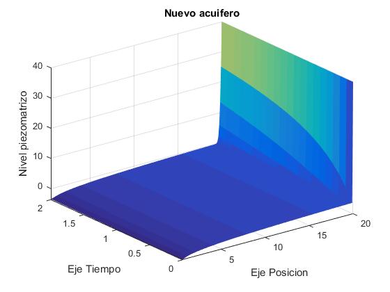 Tomando las condiciones iniciales del enunciado, resolvemos el problema por el método de diferencias finitas y aplicando el método del trapecio en tiempo, siendo [math]\Delta \rho = 0.1 [/math] , [math]\Delta t = \Delta \rho [/math] , [math] D= 0.01[/math] y [math]\rho _{0} = 0.5 [/math], de tal forma el sistema será: \[\left\{\begin{matrix}\ \frac{\partial h}{\partial t}- D·(\frac{\partial ^2 h}{\partial \rho^2}+ \frac{1}{\rho}·\frac{\partial h}{\partial \rho})=0 , & \\ h(\rho _{0},t)=34 \quad \quad h(20,t)=45 & \\ h(\rho,0)=45 & \end{matrix}\right.\]