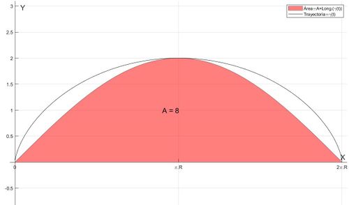 text(pi()*R,2.1*R,['$ \gamma (t) = (t-sin(t))\vec{i}+(1-cos(t))\vec{j},\hspace{0.5cm}R=1 $'],'interpreter','latex',"FontSize",17);