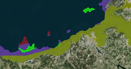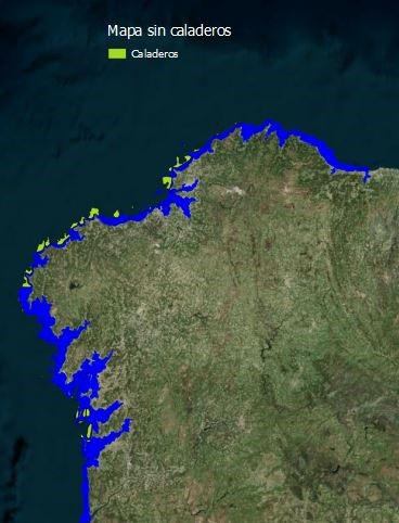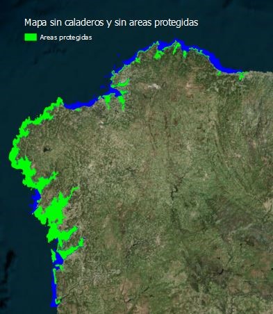Los caladeros son zonas en las que existe una elevada riqueza de pesca. Por tanto, estas zonas tienen que ser excluidas de nuestro estudio ya que afectaría negativamente tanto al medio marino, como a la economía gallega basada en la pesca. El resultado de la diferencia del mapa basa con el mapa digitalizado de los caladeros se muestra en la siguiente imagen.