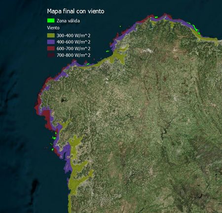 La conclusión a la que hemos llegado después de la realización de todas las operaciones sería cimentar en roca o en su defecto grava (teniendo en cuenta un tratamiento previo), siempre y cuando no se afecte a las zonas de caladeros, hábitats o zonas protegidas. Por otro lado contamos con el mapa de vientos que nos señala cuales son las zonas con mayor densidad de potencia eólica media anual y por tanto donde obtendríamos mayor rendimiento. Y para finalizar tomamos un buffer de 3000m para cumplir con la norma establecida por el Estado y no provocar un gran impacto visual en la costa gallega.