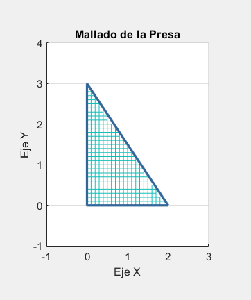 Esta grafica muestra el mallado de la placa triangular y el código utilizado en MatLab para obtenerlo. Un breve resumen del funcionamiento del codigo seria: