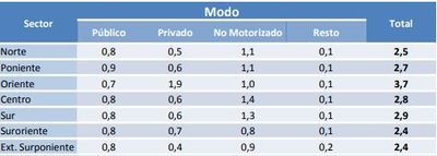 En la siguiente tabla se puede observar que el sector Oriente, que contiene los hogares con mayor ingreso promedio de la ciudad, es dónde se genera la mayor cantidad de viajes en transporte privado y la menor cantidad de viajes en transporte público. Por otro lado, en los sectores con menores ingresos, como el Suroriente, el transporte público es notoriamente más utilizado que el privado.
