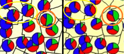 El círculo naranjo ubicado sobre la comuna de Providencia (sector oriente), evidencia una importante redistribución social. Se observa una disminución de la proporción de los hogares de mayores ingresos, y un aumento de los hogares de menores ingresos. La elipse amarilla contiene las comunas Quinta Normal e Independencia, en orden de izquierda a derecha. Se puede reconocer que proporción de hogares con mayores ingresos también disminuye. En el primer caso, es por un aumento de hogares de la categoría con menores ingresos, y en el segundo caso es por aumento de hogares de la de ingresos intermedios (color azul). La mayoría de las comunas presentan proporciones similares en ambos escenarios.