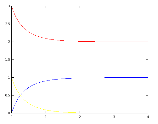 Como podemos ver en la imagen la concentración de los reactivos y productos se vuelve asintótica tendiendo la de [math]A=2 mol/l[/math], la de [math]B=0 mol/l[/math] y la de [math]C=1 mol/l[/math]. Lo que por la estequiometría de la reacción es lógico, ya que el producto [math]C[/math] dejará de formarse cuando se agote uno de los dos reactivos que lo forman; en nuestro caso disminuye progresivamente la concentración de [math]B[/math], al que se denomina reactivo limitante, y a la vez se estabilizan las concentraciones, ya que se reduce la velocidad de reacción [math]y'(t)[/math].