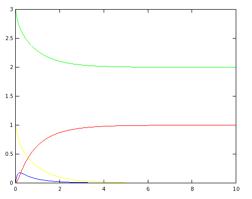 [math]\left. y_1'(t)=k_1(a_0-y_1(t))(b_0-y_1(t))-y_2'(t) \atop y_2'(t)=k_2(y_1(t)-y_2(t)) \right\}[/math]