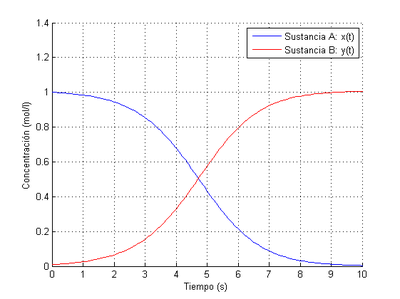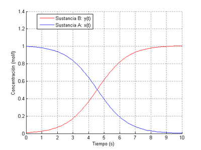 legend('Sustancia B: y(t)','Sustancia A: x(t)','Location','best');