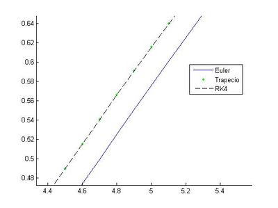 Como podemos ver en las imágenes de los dos procesos las gráficas se superponen y no se aprecian diferencias hasta que no ampliamos la imagen. Y esto sucede en todo momento con lo que podemos garantizar que en este caso el método de Euler es estable para los pasos que hemos usado.