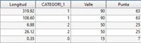 Como se mencionó con anterioridad, clasificamos las calles en calles pertenecientes al núcleo urbano, calles de pequeña longitud y calles periféricas, asignando una categoría 2, 0 y 1 respectivamente. Además a cada grupo se le asignó una velocidad, en hora punta y valle, todo ello recogido en la tabla de atributos.