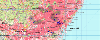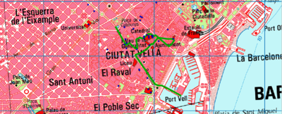 Para el estudio de las rutas turísticas por la ciudad de Barcelona el primer paso fue obtener información tanto de la cartografía como de la topografía. Para ello utilizamos, como se ha dicho en el apartado de Metodología, capas RASTER. La primera es una capa que contiene información sobre la distribución de los espacios en la ciudad. Esta capa ha sido la base para el posterior trabajo. Sobre ella añadimos los lugares de interés turístico y los trazados de las rutas, como veremos más adelante.