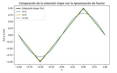 Ahora, por ser [math]f\in L^2([-1,1])[/math], utilizamos para la aproximación la base trigonométrica correspondiente [math]\left\{\frac{1}{\sqrt{2}}, \cos(n\pi x), \sin(n\pi x)\right\}_{n\in\mathbb{N}}[/math]. Sin embargo, al haber extendido la función de forma impar, el producto escalar de [math]f[/math] con las funciones pares de la base resulta ser impar. Con esto deducimos que integrar dicho producto en un intervalo simétrico da como resultado cero, pues las áreas positivas y negativas se anulan entre sí debido a la simetría de la función con respecto al origen. Entonces podemos definir [math]f_n(x)[/math] como la suma de los primeros [math]n[/math] términos de la serie de Fourier