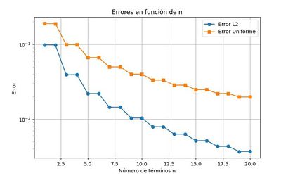 Tras el análisis anterior, veamos gráficamente como, según aumentamos la cantidad de términos de la serie, esta se aproxima mejor a la función original [math]f[/math]. En los siguientes gráficos observamos como, efectivamente, al aumentar la [math]n[/math], los primeros términos de la serie de Fourier se van acercando a nuestra función original. Así mismo, gracias a esta mejora en la aproximación, en la segunda gráfica podemos apreciar como el error disminuye conforme aumenta [math]n[/math]. Destacamos que el error de aproximación desciende del orden [math]10^{-2}[/math], que es una cifra más que aceptable teniendo en cuenta que solamente hemos tomado 20 términos de una serie infinita.