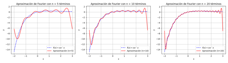A continuación aproximaremos la función \( f(x) = x e^x \) en el intervalo \([-2, 3]\) mediante su serie de Fourier. En primer lugar, calcularemos la base trigonométrica asociada al espacio \( L^2([-2, 3]) \). Definimos el espacio [math]L^2(-T, T)[/math] como el conjunto de funciones medibles [math]f(x)[/math] en el intervalo [math][-T, T][/math] tales que:[math] \int_{-T}^{T} |f(x)|^2 \, dx \lt \infty [/math]. Como ya sabemos, en el espacio [math]L^2([-\pi, \pi])[/math] la base trigonométrica asociada es: