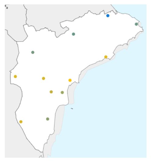 Para analizar las zonas turísticas hemos mostrado en un mapa los municipios más visitados por los viajeros. Hemos representado los municipios turísticos y los que no lo son en distintos colores para que podamos ver a simple vista los municipios más visitados. A priori pensamos que los viajeros que vuelan al aeropuerto de Alicante, lo harán para visitar estos municipios, por ello consideramos importante estudiantes conocer y localizar cuáles son.
