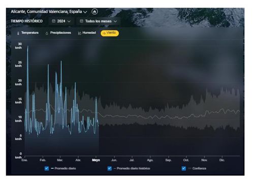 Para limitar el viento de costado se debe orientar la pista correctamente según la rosa de los vientos, después del estudio de localización, pero vamos a tener en cuenta los datos de velocidad media del viento para minimizar los problemas. Para ello, hemos analizado datos de las 12 estaciones diferentes que hay en la provincia para cubrir bien todo el territorio. Además, con el registro de tiempo histórico se puede construir el gráfico de la imagen para ver el promedio diario de viento, el promedio diario histórico y la confianza bajo la que se hacen estas predicciones.