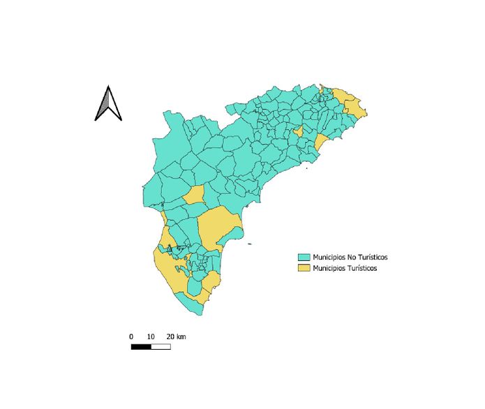 La manera de representar estos municipios turísticos ha sido mediante un nuevo campo en la tabla de atributos de cada provincia. Hemos utilizado un lenguaje en código binario dándoles una puntuación de 1 a los municipios turísticos y una puntuación de 0 a los no turísticos. Los municipios son los siguientes: