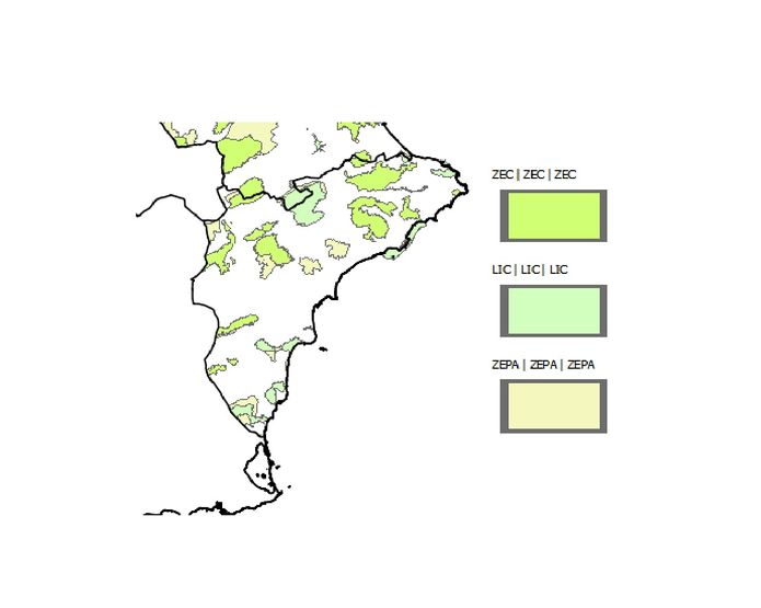 Se ha considerado el condicionamiento de la presencia de zonas protegidas en la provincia de manera que esté prohibido cualquier tipo de construcción en esas zonas por razones tanto morales por tener la conciencia de que no podemos realizar la construcción de una obra a cualquier precio, como también por motivos jurídicos y administrativos. En nuestro problema hemos realizado un mapa con las Zonas de Especial Protección para las Aves (ZEPA), los Lugares de Importancia Comunitaria (LIC), Zonas de Especial Conservación (ZEC). El resultado es el siguiente: