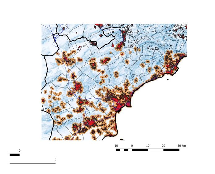 Se han tenido en cuenta los núcleos de población como otro de los criterios necesarios para analizar la localización del nuevo aeropuerto en Alicante. Hemos considerado que el aeropuerto debe estar en una zona que esté lejos de los núcleos de población, o que afecte lo menos posible, ya que creemos que un aeropuerto podría provocar malestares de niveles diversos a la gente que se encuentre en su alrededor a causa de la existencia de ruidos frecuentes y de alta intensidad. Para evitar esto, pretendemos situar nuestro aeropuerto lo más alejado de los núcleos de población. Hemos desarrollado dos buffers, un buffer de 1000 metros y otro buffer de 3000 metros. Todo ello, acaba con la obtención del siguiente mapa vectorial: