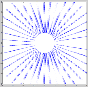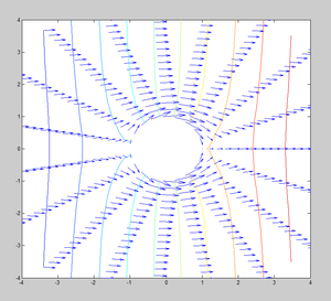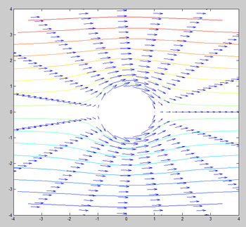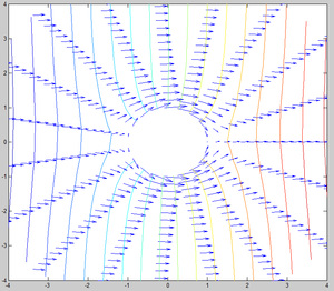 Siendo el campo [math]\vec u[/math] un campo vectorial gradiente de la función [math]φ[/math], la circulación de este campo conservativo sobre la frontera cerrada del obstáculo circular es nula.
