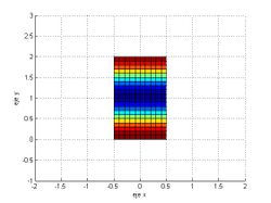 Consideramos una placa plana (en dimensión 2) que ocupa la región [math] [-1/2,1/2] \times [0,2][/math]. En ella vamos a suponer que tenemos definidas dos cantidades físicas: la temperatura [math]T(x,y,t)[/math], que depende de las dos variables espaciales [math](x,y)[/math] y el tiempo [math]t[/math], y los desplazamientos [math]\vec u(x,y,t)[/math]. De esta forma, si definimos [math]r_0(x,y)[/math] el vector de posición de los puntos de la placa en reposo, la posición de cada punto [math](x,y)[/math] de la placa en un instante de tiempo [math]t[/math] viene dada por: [math] \vec r (x,y,t)= \vec r_{0}(x,y)+\vec u(x,y,t). [/math] Vamos a suponer que sobre la placa se ha aplicado una fuerza que ha provocado una vibración de manera que los desplazamientos vienen dados por la onda: [math] \vec u(x,y,t) = \vec a \sin(\vec b \cdot \vec r_0-ct), [/math] donde [math]\vec a[/math] se conoce como amplitud, [math]\vec b[/math] es la fase que indica la dirección de propagación y [math]c/|\vec b|[/math] es la velocidad de propagación.