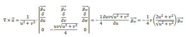 [math]\nabla\vec{u}= \begin{bmatrix} \frac{\partial u^u}{\partial u} + \Gamma ^1_{11} u^u & \frac{\partial u^u}{\partial v} + \Gamma ^1_{12} u^u & \frac{\partial u^u}{\partial w} + \Gamma ^1_{13} u^u \\ \frac{\partial u^v }{\partial u} + \Gamma ^{2}_{11}u^u & \frac{\partial u^v }{\partial v} + \Gamma ^{2}_{12}u^u & \frac{\partial u^v }{\partial w} + \Gamma ^{2}_{13}u^u \\ \frac{\partial u^w }{\partial u} + \Gamma ^{3}_{11}u^u &\frac{\partial u^w }{\partial v} + \Gamma ^{3}_{12}u^u&\frac{\partial u^w }{\partial w} + \Gamma ^{3}_{13}u^u\end{bmatrix}=\begin{bmatrix}-2- \frac{2u^2}{u^2+v^2} & \frac{-2uv}{u^2+v^2} & 0 \\\frac{2uv}{u^2+v^2} & \frac{-2u^2}{u^2+v^2} & 0\\0&0&0 \end{bmatrix}\qquad\nabla \vec{u}^t=\begin{bmatrix}-2- \frac{2u^2}{u^2+v^2} & \frac{2uv}{u^2+v^2} & 0 \\\frac{-2uv}{u^2+v^2} & \frac{-2u^2}{u^2+v^2} & 0\\0&0&0 \end{bmatrix}[/math]: