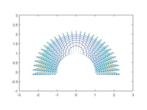 La divergencia es mínima en [math]ρ=1[/math] y máxima en [math]ρ=2[/math]. Esto se puede calcular intuitivamente viendo la ecuación de divergencia en coordenadas cilíndricas. En nuestra figura, la divergencia no se anula. Pasamos la divergencia a coordenadas cartesianas, para introducirlo en Matlab: [math]div(\vec u)= \frac {1} {5} *(2-\frac {1} {\sqrt {x^2+y^2}})[/math]