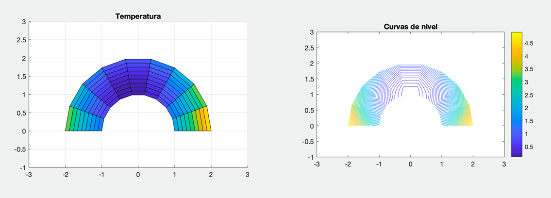 El siguiente paso será representar a partir del campo escalar de temperaturas : [math]T(x,y)=x^2+(y-1)^2[/math] (como puede verse, en coordenadas cartesianas), la temperatura en cada punto de la placa usando de un sistema de colores, de temperaturas más frías (colores azules) a temperaturas más altas (colores amarillos). Se han hecho dos representaciones, la de la izquierda muestra el campo escalar de temperaturas y la de la derecha representa las curvas de nivel del campo [math]T(x,y)[/math] en la placa.