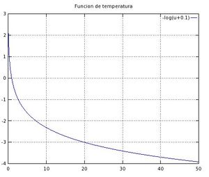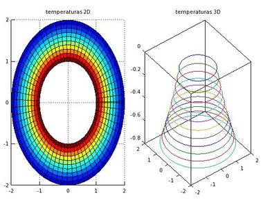 Supongamos que tenemos un foco de calor en el centro de la placa circular, esta temperatura varía dependiendo solo del radio [math]ρ[/math], rigiéndose según la función [math]T(\rho,\theta)=-\log(\rho+0.1)[/math], como muestra la figura 2. Al ser una función logarítmica disminuye cuando aumenta el radio, por lo que la temperatura es más alta cuanto más nos acercamos al centro, como se observa en la figura 3, a la izquierda, en la que el centro queda el color rojo (más caliente, mayor temperatura) variando gradualmente hasta el azul (más frío, menor temperatura). De esta manera se define para cada radio una superficie equipotencial, es decir la variación de temperatura a lo largo de esa circunferencia es nula. En la misma figura, a la derecha, se puede observar como varía la temperatura en función del radio, estando ésta representada en el eje Z de la gráfica.
