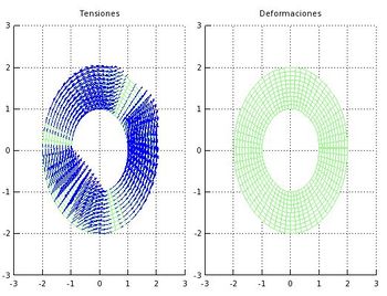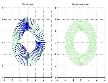 Al aplicar el tensor de tensiones a nuestro campo vectorial tenemos que la divergencia obtenida es igual a 0 (ver ap. Divergencia y rotacional) y por tanto queda que [math] \sigma_{ij}=2\mu \epsilon_{ij}, [/math] Si tomamos [math]\lambda=\mu=1[/math] tenemos que [math]\sigma_{ij}=2·1·(\nabla \vec u + \nabla \vec u^t)/2=(\nabla \vec u + \nabla \vec u^t)[/math]y podemos ver que únicamente depende del parámetro μ, módulo de elasticidad transversal, por lo que las tensiones que analizaremos ahora serán únicamente las normales.