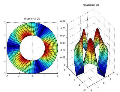 La representación del rotacional tiene forma de función cosenoidal. El valor del rotacional varía además en función del valor de [math]\rho[/math], haciéndose más pequeño a medida que [math]\rho[/math] crece (son inversamente proporcionales). Todo esto aparece representado en la parte derecha de la figura 8. En la parte izquierda de la figura tenemos representada la misma gráfica vista desde arriba (dos dimensiones). El color refleja el valor del rotacional, siendo el rojo los valores más altos y el azul los más bajos.