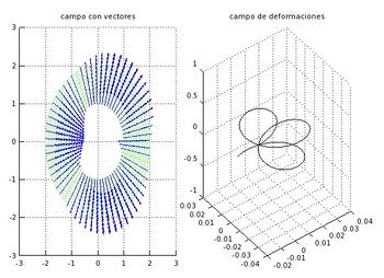El campo provoca deformaciones en el plano OXY, como se puede ver en la figura 5, que representa el campo de deformaciones en 3 dimensiones a la derecha. A la izquierda aparece representado el campo en el plano OXY. Los vectores representan la dirección, módulo y sentido del campo en cada punto. Podemos ver que el valor del campo no es uniforme, sino que varía según el punto del anillo en el que nos encontremos. Hay tres zonas de valor máximo y tres de valor mínimo, como muestra el módulo de los vectores. Tomaremos el valor del campo vectorial [math] \vec u [/math] en cada punto como el desplazamiento en dicho punto. Así tenemos que el vector posición será: