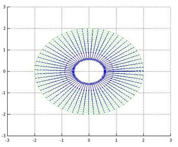 A raíz de este resultado, diremos que el campo vectorial [math] \vec u[/math] es adivergente [math] ( \nabla \cdot \vec u = 0)[/math] , esto es, el anillo no actúa como fuente [math] ( \nabla \cdot \vec u \gt 0)[/math] o sumidero [math] ( \nabla \cdot \vec u \lt 0)[/math] en ningún punto de la superficie. Se trata de un sólido incompresible.