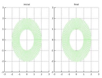 En la figura 6 hemos representado la posición inicial y final del anillo según el desplazamiento descrito. Apenas se aprecia la deformación, pero esto es debido a que esta tiene un valor muy pequeño, al encontrarse dividido entre [math] 30\rho [/math] .