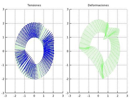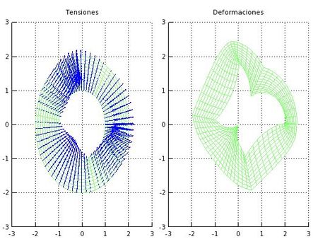 En las figuras 12 y 14 que se definen a continuación vemos que las deformaciones debidas a las tensiones tangenciales son inapreciables. Podemos reducir en nuestro programa de Matlab el valor del denominador, que es inversamente proporcional a la deformación, y ver como se deforma la placa. La deformación es mayor en los puntos cuya tensión es mayor. Gráficamente, el módulo de la tensión viene determinado por la longitud de cada flecha de tensión. También apreciamos que la deformación es mayor en las regiones de la placa con mayor densidad de flechas de campo.