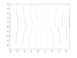 Las líneas de corriente del campo [math]\vec{u}[/math] son tangentes al campo vectorial, es decir, a la velocidad que es el gradiente de la función potencial. Esto, lo hemos comprobado en los apartados anteriores al hallar que el rotacional y la divergencia son 0. Vamos a dibujar las lineas de campo para lo que calculamos el siguiente vector: