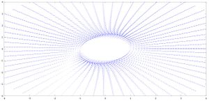En el cálculo vectorial, el rotacional o rotor es un operador vectorial que muestra la tendencia de un campo vectorial a inducir rotación alrededor de un punto. El campo vectorial [math]vec{u}[/math] que equivale a la velocidad de las partículas y es el gradiente de la función potencial es de rotacional nulo. Cálculo analítico : [math]\nabla\times\vec{u}= \frac {1}{g^\frac{1}{2}}\begin{pmatrix} \vec{g_ρ} & \vec{g_θ} & \vec{g_z} \\ \frac{ \partial}{\partial ρ} & \frac{\partial }{\partial θ} & \frac{\partial }{\partial z}\\ u_1 & u_2 & u_3 \end{pmatrix}= \frac {1}{ρ} \begin{pmatrix} \vec{g_ρ} & \vec{g_θ} & \vec{g_z} \\ \frac{ \partial}{\partial ρ} & \frac{\partial }{\partial θ} & \frac{\partial }{\partial z}\\ cos(θ)(1 - \frac {1}{ρ^2})& - sen (θ) (ρ + \frac {1}{ρ}) & 0 \end{pmatrix}=[/math] [math]=\frac {1}{ρ}(\frac{\partial}{\partial z}(cos(θ)(1 - \frac {1}{ρ^2}))\vec{g_θ} ) - (\frac{\partial}{\partial ρ}(sen (θ) (ρ + \frac {1}{ρ}))\vec{g_z})-(\frac{\partial}{\partial θ}((cos(θ)(1 - \frac {1}{ρ^2})\vec{g_z}) + (\frac{\partial}{\partial z}(sen (θ) (ρ + \frac {1}{ρ}))\vec{g_ρ})=[/math] [math]=\frac {1}{ρ}(-sen(θ) (1- \frac{1}{ρ^2}) \vec{g_z} + sen(θ) (1- \frac{1}{ρ^2}) \vec{g_z})= 0 [/math]