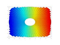 La divergencia de un campo vectorial mide la diferencia entre el flujo saliente y el flujo entrante de un campo vectorial sobre la superficie que rodea a un volumen de control, por tanto, si el campo tiene "fuentes", la divergencia será positiva y si tiene "sumideros", la divergencia será negativa. También puede ocurrir que la divergencia sea 0, como ocurre en nuestro caso. Esto implica que el flujo es incompresible. Cálculo analítico: [math]\nabla·\vec{u}= \frac {1}{g^\frac{1}{2}}\frac{\partial }{\partial x^i}(g^\frac{1}{2} u^i)= [/math] [math]= \frac {1}{ρ}(\frac{\partial }{\partial ρ}(ρ u^ρ) + \frac{\partial }{\partial θ}(ρ u^θ) + \frac{\partial }{\partial z}(ρ u^z))=[/math] [math]\frac {1}{ρ}(\frac{\partial }{\partial ρ}((ρ - \frac{1}{ρ})cos(θ)) - (\frac{\partial }{\partial θ}(1 + \frac{1}{ρ^2})sen(θ)) + 0 )=[/math] [math]\frac {1}{ρ}((1 + \frac{1}{ρ^2})cos(θ) - (1 + \frac{1}{ρ^2})cos(θ))=\frac{1}{ρ} (0)= 0[/math]