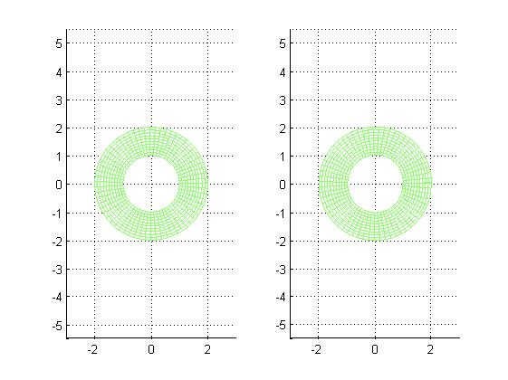 Vamos a realizar el estudio de una placa plana con forma de corona circular centrada en el origen y de radio interior 1 y radio exterior 2, al verse sometida a diversos campos. Para empezar, representamos el mallado sobre el que vamos a trabajar. La visualización de la misma nos sirve para situar la placa en nuestro espacio de trabajo.