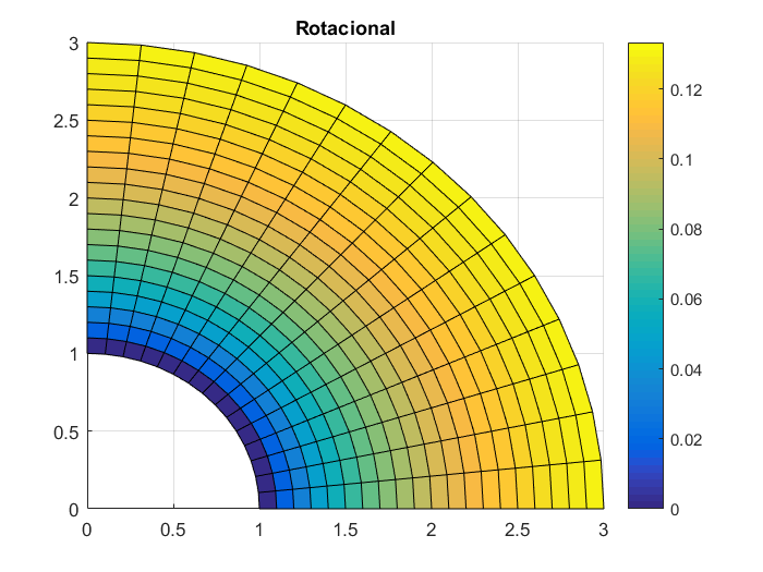 Se ha calculado el rotacional del campo de desplazamientos u en todos los puntos del sólido y lo representamos. Hemos obtenido que el rotacional es: Rot [u(rho,theta)] = (rho-1)/(5*rho)gz. Observando la gráfica se obtiene cuáles son los puntos que sufren un mayor rotacional: Los puntos con mayor rotacional son aquellos con theta=PI/4 y su valor es 0.1333.