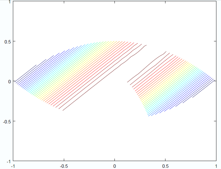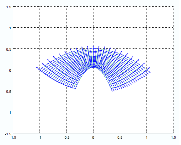 Visualización de campos escalares y vectoriales en elasticidad. Consideramos una placa plana (en dimensión 2) que ocupa la región comprendida entre las parábolas:[math] P1(x,y): 18·y-81·x^2-1=0 [/math], y [math] P2(x,y): 2·y +x^2 −1 = 0 [/math]. Para representarla usaremos un sistema de coordenadas adaptado a la geometría que nos dan:[math] x = u·v [/math],[math] y =\frac{1}{2}(u^2 − v^2)[/math];con u y v definidas en (u, v) ∈ [1/3, 1] × [−1, 1].