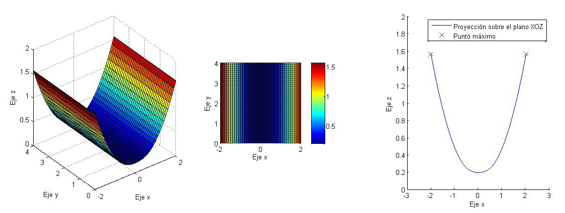 Por otro lado, dada la forma de la superficie, ésta se ha proyectado sobre el plano \(XZ\). De esta manera, los puntos máximos que se pueden ver en la proyección representan la proyección de las rectas máximas de la superficie sobre el plano \(XZ\). El valor máximo de [math]\sigma_{VM}[/math] se aporta en forma de mensaje, en el código, mediante el comando fprintf.