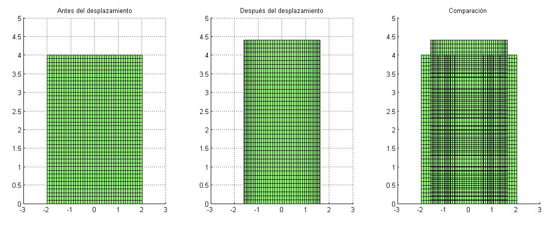 Consideramos una placa rectangular plana (en dimensión 2) que ocupa la región \((x,y) ∈ [−2,2]×[0,4]\). En ella vamos a suponer que tenemos definidas dos cantidades físicas: la temperatura \(T(x,y)\), que depende de las dos variables espaciales \((x,y)\), y los desplazamientos [math]\vec u(x,y)[/math] producidos por la acción de una fuerza determinada. De esta forma, si definimos [math]\vec r_{0}(x,y)[/math] el vector de posición de los puntos de la placa antes de la deformación, la posición de cada punto \((x,y)\) de la placa después de la deformación viene dada por: [math]\vec r(x,y) = \vec r_{0}(x,y) + \vec u(x,y)[/math] Vamos a suponer que la fuerza aplicada sobre la placa ha provocado un desplazamiento de los puntos de la misma dado por el vector de desplazamientos: [math]\vec u(x,y)=-\frac{x^3}{20}\vec i+f(y)\vec j[/math] donde \(f(y)\) es una cierta función.