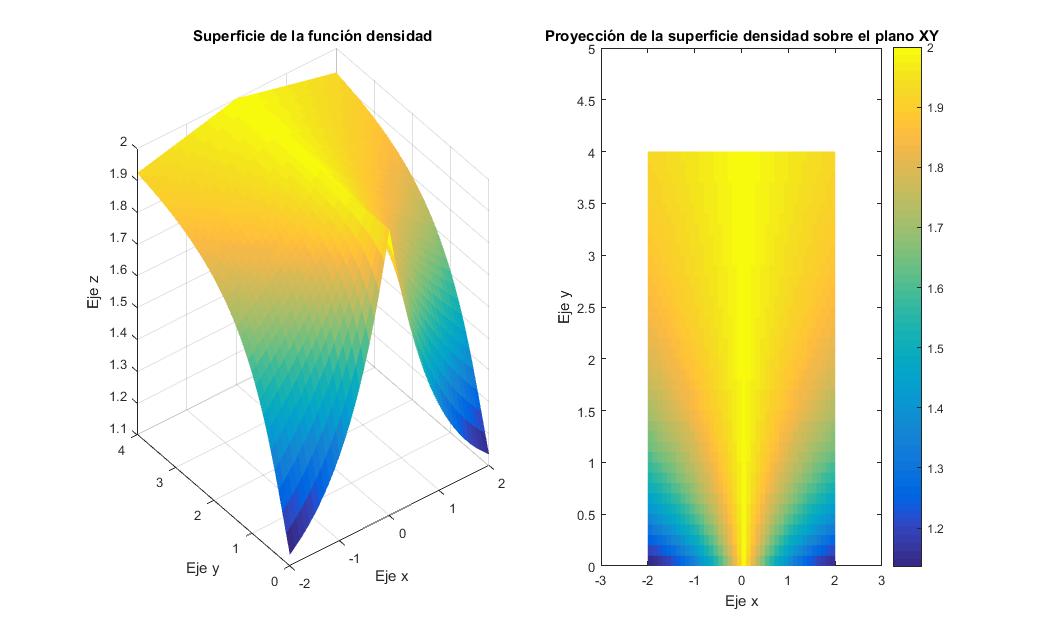 A continuación, tenemos la representación de la función densidad en [math]R^3[/math]; así como también, su proyección sobre el plano \(XY\).