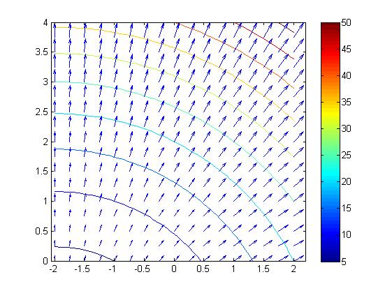 - Dicho sea de paso, los vectores del campo gradiente no están aplicados en todos los puntos de la malla obtenida inicialmente, con la finalidad de conseguir menos vectores representados y por tanto, una mejor visualización.