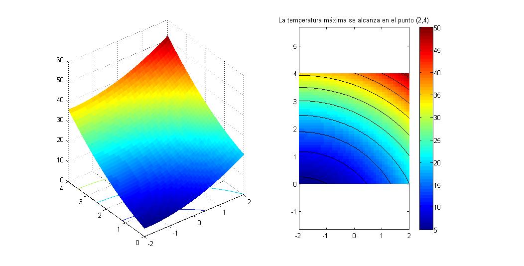 Por lo tanto, en ambos modelos podemos observar perfectamente que la temperatura máxima de la placa se corresponde con el punto \((2,4)\); es decir, el extremo superior derecho. Esto se deduce fácilmente a partir de la visualización del campo y de sus curvas de nivel.
