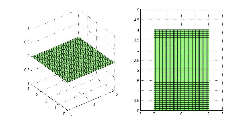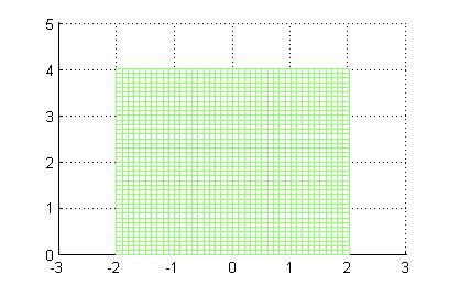 En este caso, hemos considerado los ejes en el rectángulo \((x,y) ∈ [−3,3] × [0,5]\) y como paso de muestreo \(h=1/10\) para las variables \(x\) e \(y\). De esta manera, para la obtención de la representación gráfica del mallado se ha empleado el código de Matlab que se puede ver a continuación: