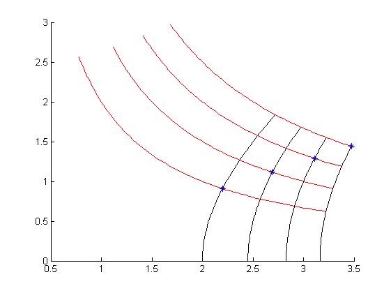 El procedimiento utilizado consiste en mantener una variable constante y definir la función asociada al parámetro que varía. Para los dos casos se obtienen hipérbolas equiláteras con asíntotas en los ejes coordenados. A continuación se representan como ejemplo algunas líneas coordenadas asociadas a las coordenadas hiperbólicas para varios puntos del mallado.