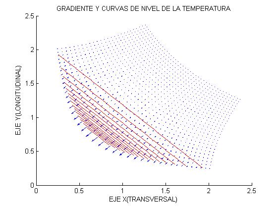 Con la determinación del gradiente podemos definir la dirección en la cual el campo escalar definido por la temperatura varía más rápidamente y su módulo representa el ritmo de variación en la dirección de dicho vector gradiente. En este caso su módulo aumenta al aproximarnos al origen de coordendas por la existencia del foco de calor. Además se observa gráficamente que el vector gradiente es perpendicular a sus curvas de nivel.