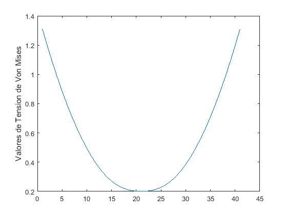 max(max(valVM))El punto en el que se alcanza mayor valor de la tensión de Von Mises es en x=-2 y x=2 y la tensión máxima es 1.3115.
