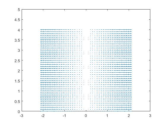 Para obtener el campo de fuerzas [math]\vec F[/math] usamos la ecuación de la elasticidad lineal: [math] \vec F =-\nabla\cdot \sigma=-\frac{\partial \sigma_{ji}}{\partial x_{j}}\vec e_{i}[/math]. Siendo [math]\sigma[/math] la matriz tensor de tensiones podemos ver que la ecuación de la elasticidad lineal solo tendrá valor distinto de 0 cuando i,j sean 1.: [math]F_x=-\frac{\partial \sigma_{11}}{\partial x_{1}}\vec e_{1}=-\frac{\partial (-\frac{9x^2}{20}+\frac{1}{10})}{\partial x}\vec i=\frac {9x}{10}\vec i[/math] Dibujamos el campo de fuerzas [math]\vec F[/math] mediante el siguiente código de matlab: