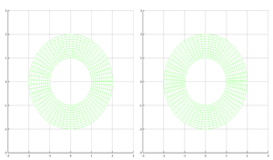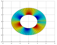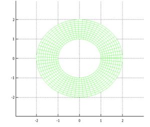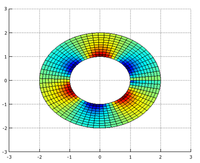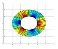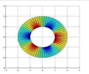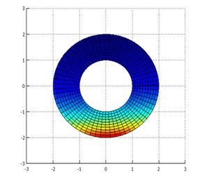 Consideramos una placa circular comprendida entre las circunferencias de radio 1 y radio 2, centradas en el origen. En ella vamos a suponer que tenemos definidas dos cantidades físicas: la temperatura [math]T(\rho,\theta,t)[/math] y el tiempo [math]t[/math], y los desplazamientos [math]\vec u(\rho,\theta,t)[/math].De esta forma, si definimos [math]r_0(\rho,\theta)[/math] el vector de posición de los puntos de la placa en reposo, la posición de cada punto [math](\rho,\theta)[/math] de la placa en un instante de tiempo [math]t[/math] viene dada por: [math] \vec r (\rho,\theta,t)= \vec r_{0}(\rho,\theta)+\vec u(\rho,\theta,t). [/math] Vamos a suponer que sobre la placa se ha aplicado una fuerza que ha provocado una vibración de manera que los desplazamientos en un instante [math]t_0[/math] vienen dados por: [math]\vec u(\rho,\theta)=\frac{\sin(\pi \theta)}{20\rho^2}\vec g_{\theta}. [/math]